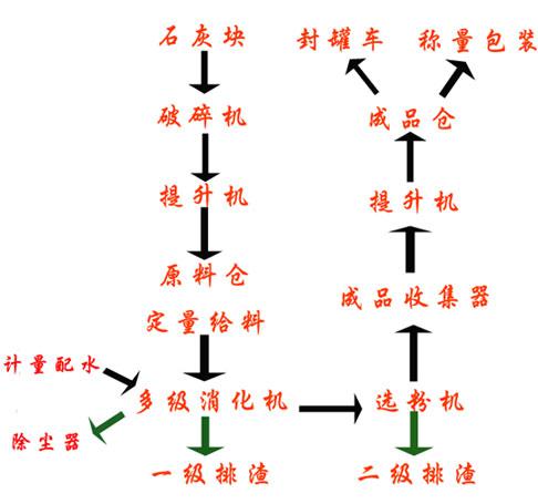 原料生石灰由裝載機加料倉中,并由振動給料機均勻給料到破碎機破碎10mm以下。破碎后的生石灰經(jīng)輸送設(shè)備送入多級消化器。加水攪拌經(jīng)多級消化反應(yīng)生成氫氧化鈣。消化過程中產(chǎn)生水蒸氣及揚塵經(jīng)除塵器過濾后排空。消化后氫氧化鈣經(jīng)輸送設(shè)備送入氫氧化鈣分級機(選粉機)分級。合格細粉經(jīng)輸送設(shè)備送入成品料倉。不合格粗粉排查或根據(jù)工藝要求經(jīng)輸送設(shè)備送入磨機(雷蒙磨)研磨。磨后經(jīng)螺旋收粉器收集細粉。經(jīng)輸送設(shè)備送入氫氧化鈣分級機(選粉機)分級。合格細粉經(jīng)輸送設(shè)備送入成品料倉。雷蒙磨富余含塵氣體布袋除塵器過濾排空。收集細粉經(jīng)輸送設(shè)備送入氫氧化鈣分級機(選粉機)分級。合格細粉經(jīng)輸送設(shè)備送入成品料倉。